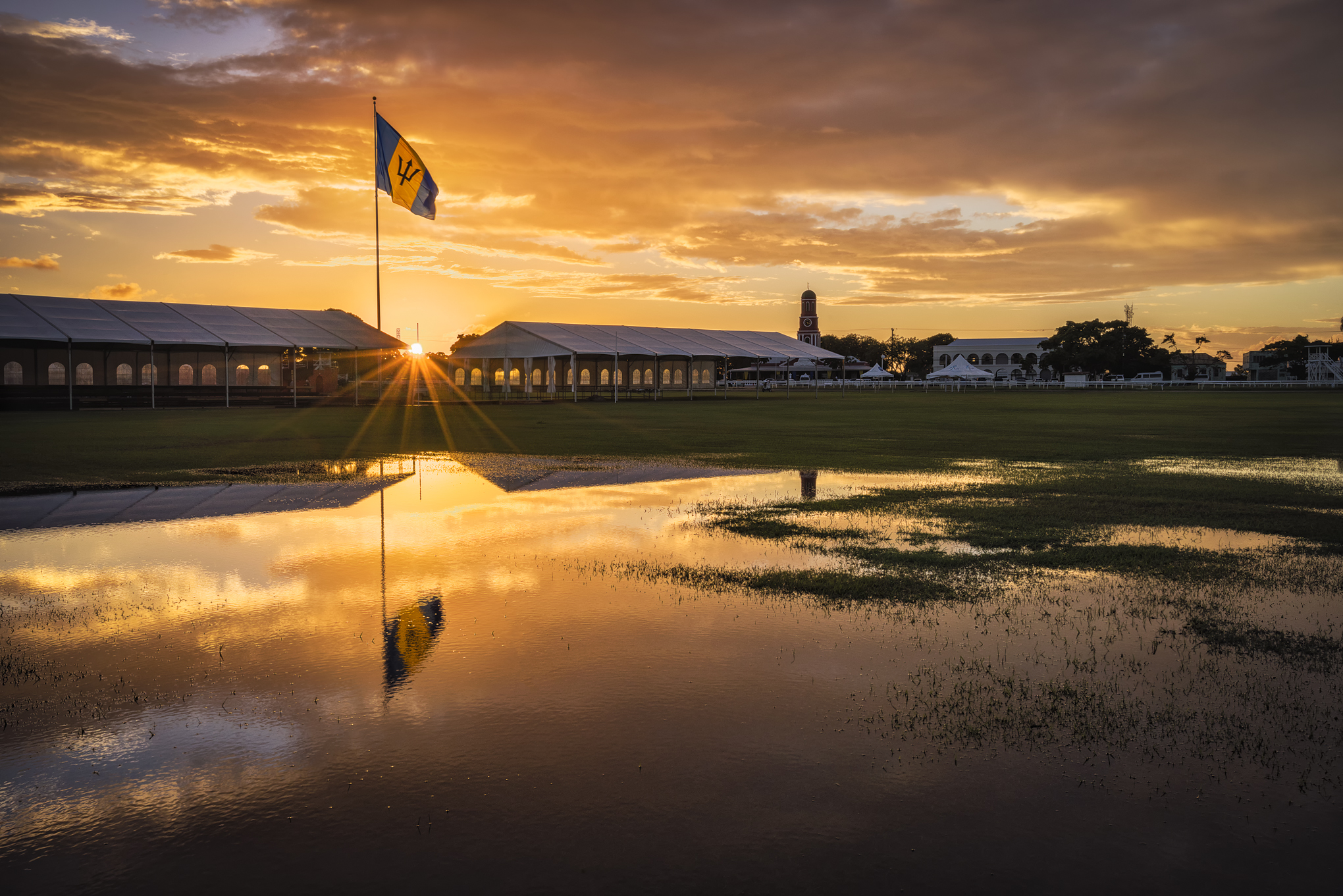 As the day draws to a close, the last light of the sun settles gently over the Garrison Savannah, casting long shadows and warm gilded patina across the open field. A shallow pool of rainwater becomes a mirror, reflecting sky, flag, and fading light, turning a fleeting moment into something quietly timeless.
